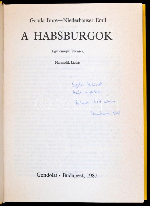 Gonda Imre - Niederhauser Emil: A Habsburgok. Egy európai jelenség. Bp., 1987, Gondolat. Harmadik kiadás. Kiadói vászonkötésben, papír védőborítóval. Niederhauser Emil által dedikált példány!