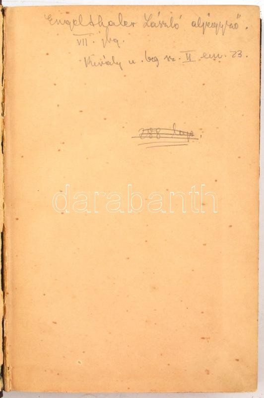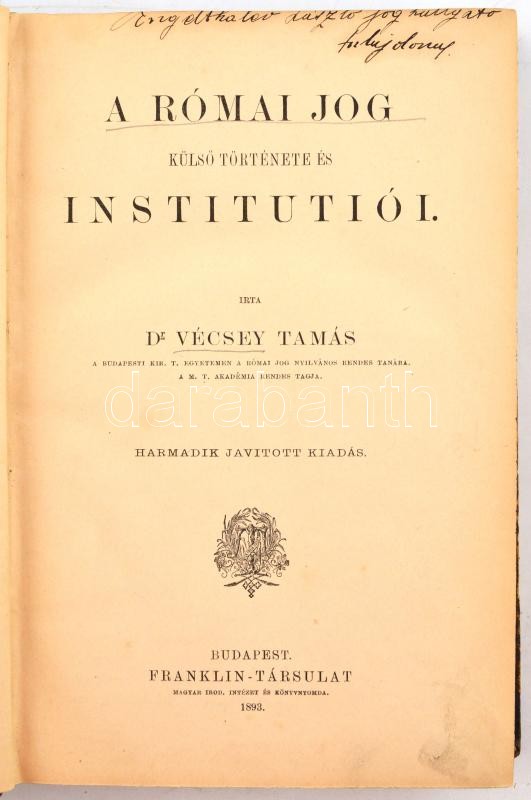 Dr. Vécsey Tamás: A Római jog külső története és institutiói. Engelthaler László aljegyző tulajdona. Bp., 1893, Franklin-Társulat. Átkötött kopott félvászon-kötésben.