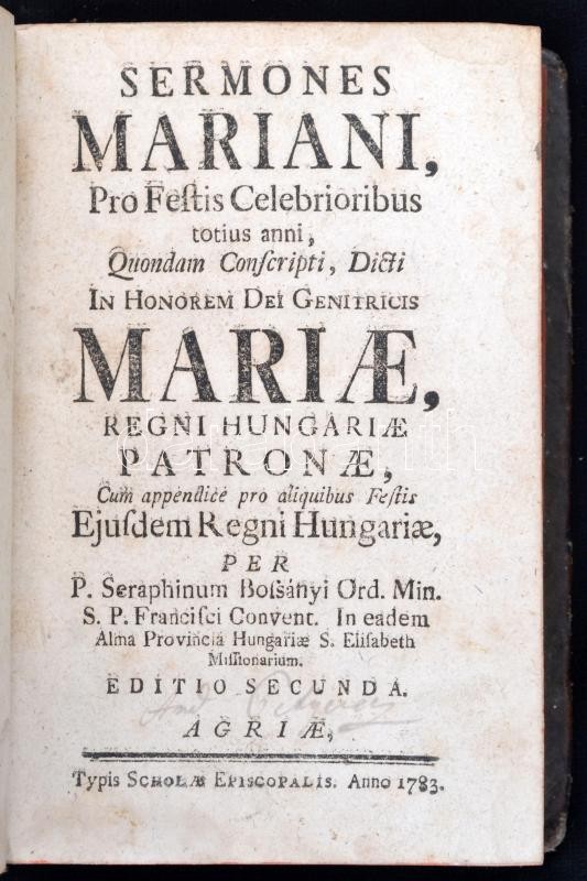 [Bossányi Szerafin (1713-1785)]: Seraphinus Bossányi: Sermones Mariani, pro festis celebrioribus totius anni, quondam conscripti, dicti, in honorem Dei genitricis Mariae, regni Hungariae patronae, cum appendice pro aliquibus festis ejusdem regni Hungariae, ... Editio Secunda. Agriae, 1783., Typis Schlae Episcopalis, 6 sztl. lev.+571+1 p.+ 3 sztl. lev. Latin nyelven. Korabeli egészbőr-kötésben, aranyozott gerinccel, a gerincen piros, aranyozott feliratú címkével, festett lapélekkel, kopottas borítóval, possessori bejegyzéssel.