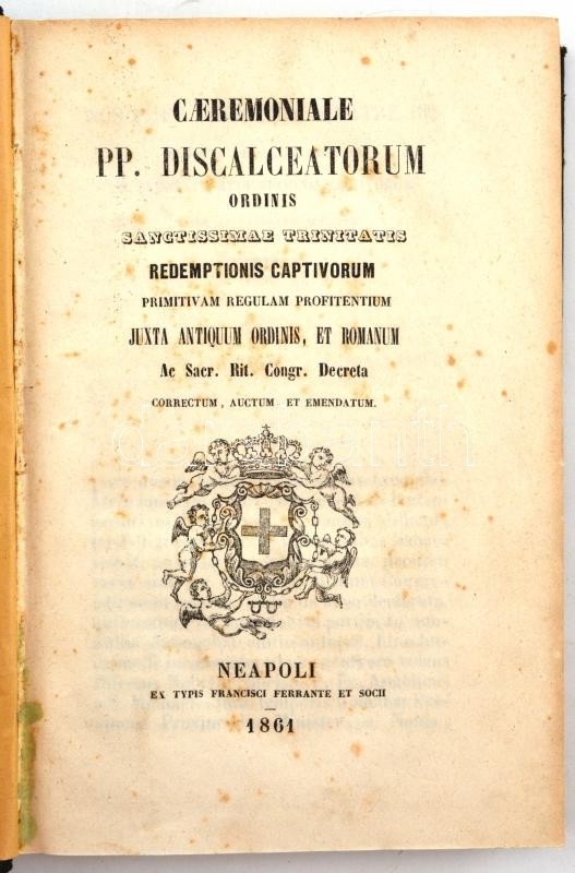 Caeremoniale pp. discalceatorum Ordinis sanctissimae Trinitatis redemptionis captivorum primitivam regulam profitentium, juxta antiquum ordinis, et romanum. Ac Sacr. Rit. Congr. Decreta. Correctum, auctum, et emendatum. 2 db rézmetszetű illusztrációval. Hozzákötve: Manuale pp. discalceatorum Ordinis sanctissimae Trinitatis redemptionis captivorum primitivam regulam profitentium. Neapoli, 1861, ex typis Francisci Ferrante et socii. Félvászon kötésben, foltos lapokkal.