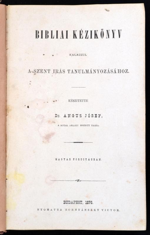 Dr. Angus József: Biblia kézikönyv kalauzul a szent írás tanulmányozásához. Bp., 1876., Hornyánszky Viktor, 4+735 p.+ 1 (térkép) t. Kiadói egészvászon-kötés, kopott, foltos borítóval, kissé sérült gerinccel, a könyv gerince részben elvált a borítótól, a címlap és az első lap, valamint a térkép kijár, néhány lap szélén kis szúrágta lyukakkal. Nagyon ritka!