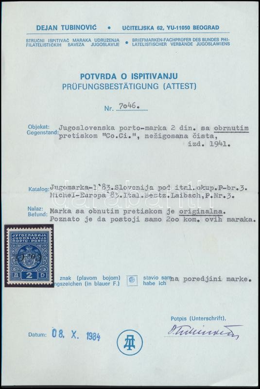 Beschreibung: Laibach olasz megszállás 1941 Porto Mi 3 fordított felülnyomással. Certificate: Tubinovic
