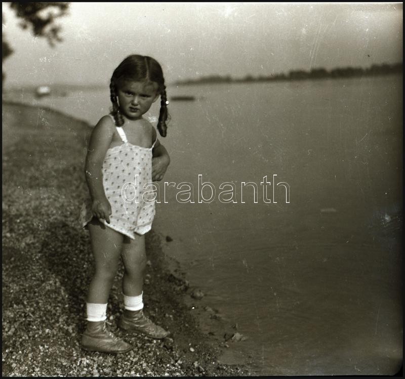 Beschreibung: cca 1937 Kinszki Imre (1901-1945) budapesti fotóművész hagyatékából, vintage NEGATÍV (Kinszki Juditka a Duna partján), 6x9 cm