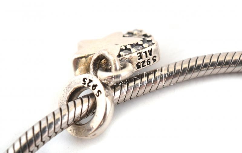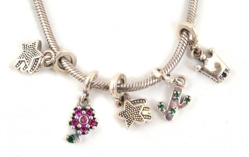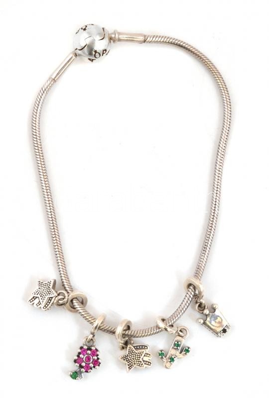 Beschreibung: Ezüst(Ag) karkötő, charmokkal (5 db), Pandora jelzéssel, h: 20 cm, bruttó: 11 g