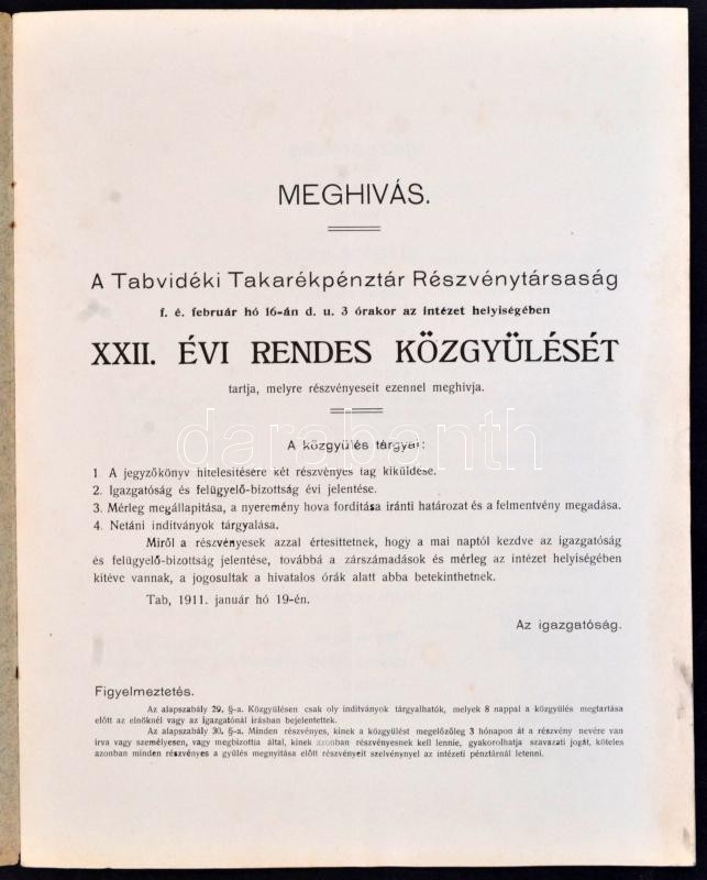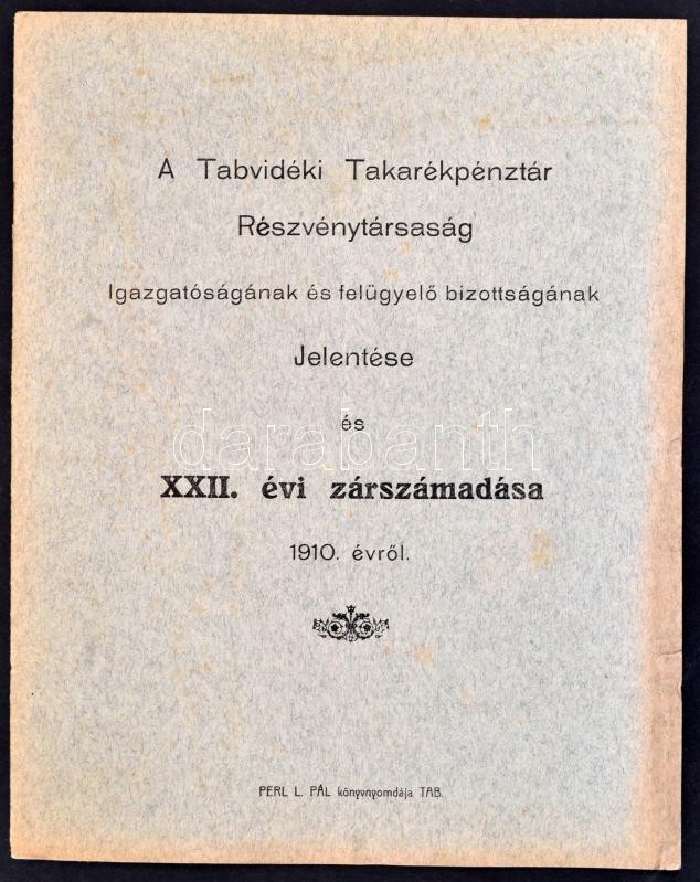A Tabvidéki Takarékpénztár Rt. jelentése és XXII. évi zárszámadása az 1910. évről; Perl L. Pál nyomdájam Tab. Papírkötés, borítón kisebb szakadással, hajtásnyommal.