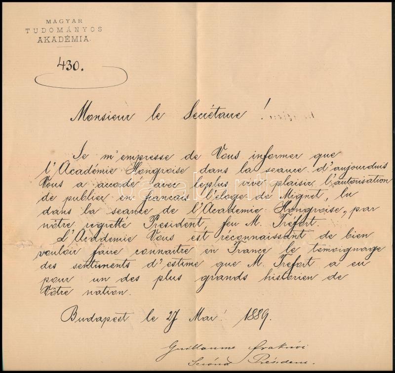 1889 Fraknói Vilmos (1843-1924.) történetíró, váradi kanonok, arbei címzetes püspök, a Magyar Tudományos Akadémia titkára által aláírt levél akadémiai levélpapíron feltehetően a Francia Tudományos Akadémia elnökének.