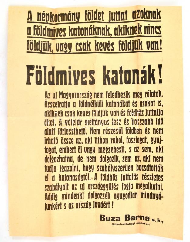 1918 Földműves katonák részére való majdani földosztásról szóló hirdetmény. Búza Barna a Károlyi kormány földművelésügyi miniszterének hirdetménye Bp., Pallas, 39x52 cm