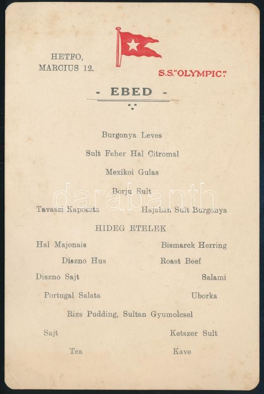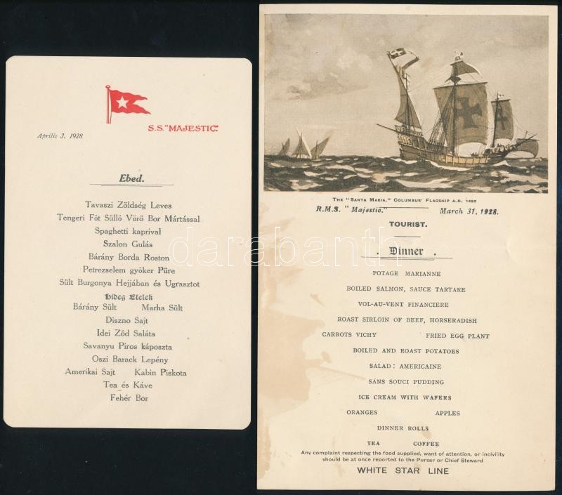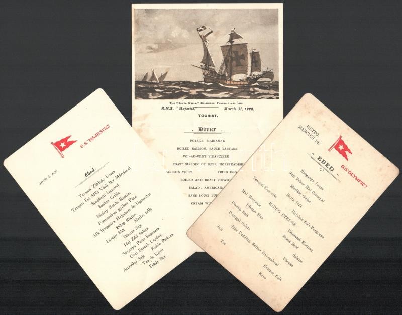 1928 Kossuth-zarándoklat amerikai útjának menükártyái az S.S. Olympic (1 db), és az S.S. Majestic (2 db) tengerjárókról, borítékkal, 21x12 cm és 15,5x10,5 cm közötti méretben