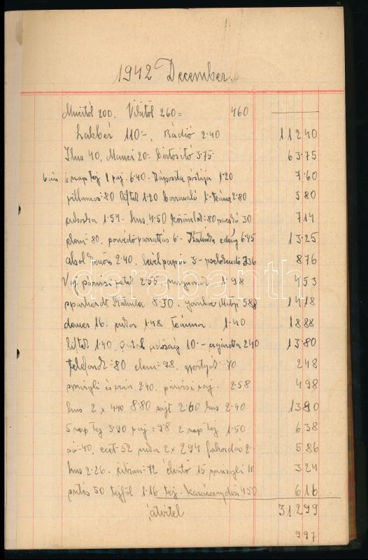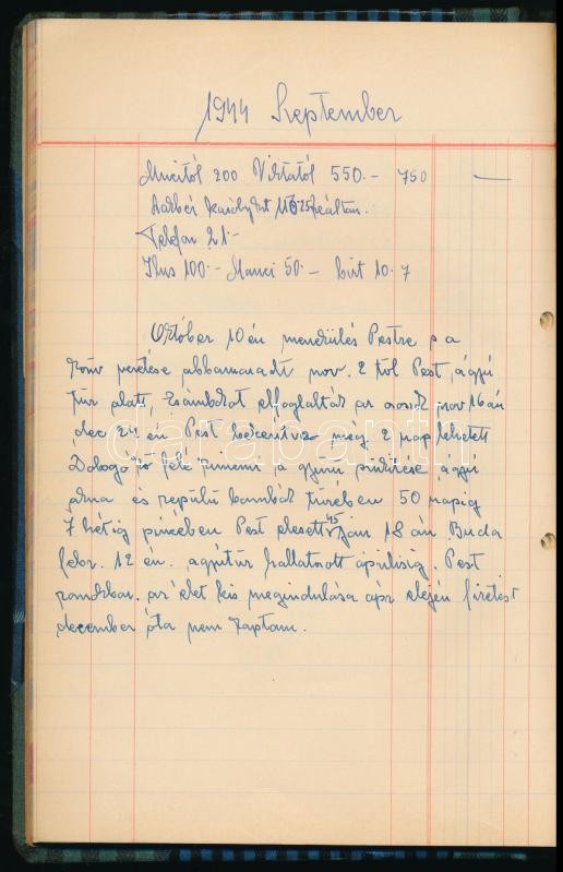 1942-47 Háztartás könyvecske és részben II. világháborús napló 1944-45-ből, a Budapesti ostromi idejéről. Kézzel írt füzet bejegyzésekkel a különböző kiadásokról, bevételekről, egyenleggel stb., félvászon kötésben, jó állapotban