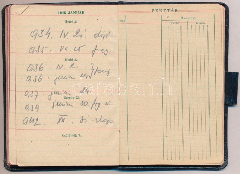 1945 Szövetkezeti bolt naptár, II. világháborús napló, bejegyzésekkel 1945 március közepétől kezdve (Kőszeg, Kaszárnya u.), majd március végén folytatva. Márc. 27: "... nagy orosz tűzijáték. Az esti holdfényben látni lehet az igen alacsonyan szálló orosz gépeket ...)" Márc. 28: "Hajnalra riadó, orosz tüzérség lövi a táborhelyünket...5h-kor lépjük át a határt.Mikor jövök vissza!" Április 27: "Göring lemondott. Hitler haldoklik?" stb. Utolsó bejegyzés 1945. aug. 24. Sattinger-Morvay Viktor rendőr kapitány hagyatékából.