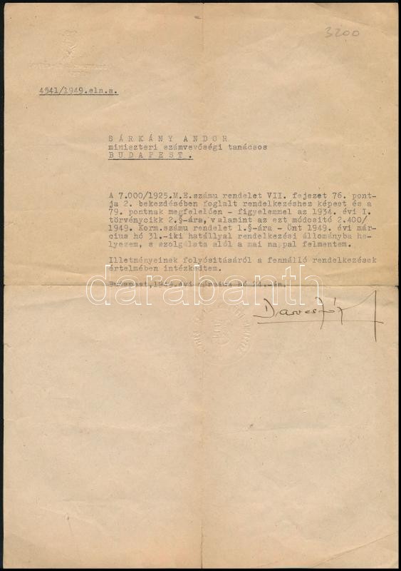 1949. Budapest, Sárkány Andor miniszteri számvevőségi tanácsosnak címzett levél Darvas József építés- és közmunkaügyi minisztertől