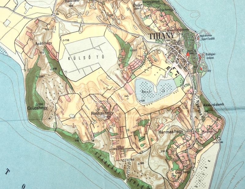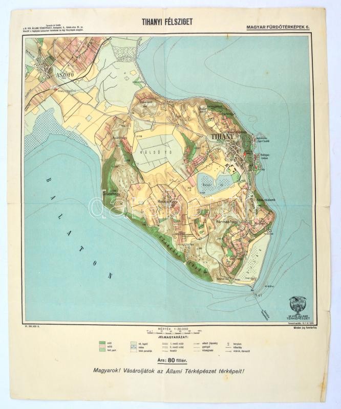 1928 Tihanyi félsziget, Magyar Fürdőtérképek 6., 1: 20.000, Bp., M. Kir. Állami Térképészet, hajtásnyomokkal, kis szakadással a hajtások mentén, 42x34 cm