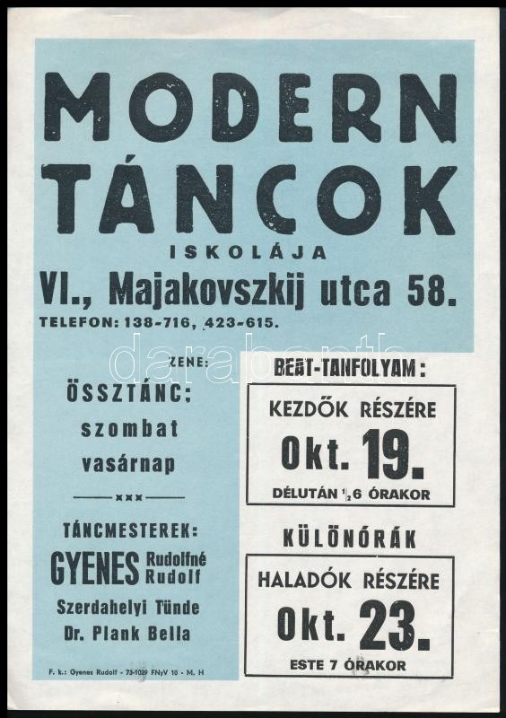 cca 1973 Modern Táncok iskolája (VI., Majakovszkij u. 58.) 2 db kisplakátja, táncmesterek: Gyenes Rudolf, Gyenes Rudolfné, Szerdahelyi Tünde, Dr. Plank Bella, 24x17 cm