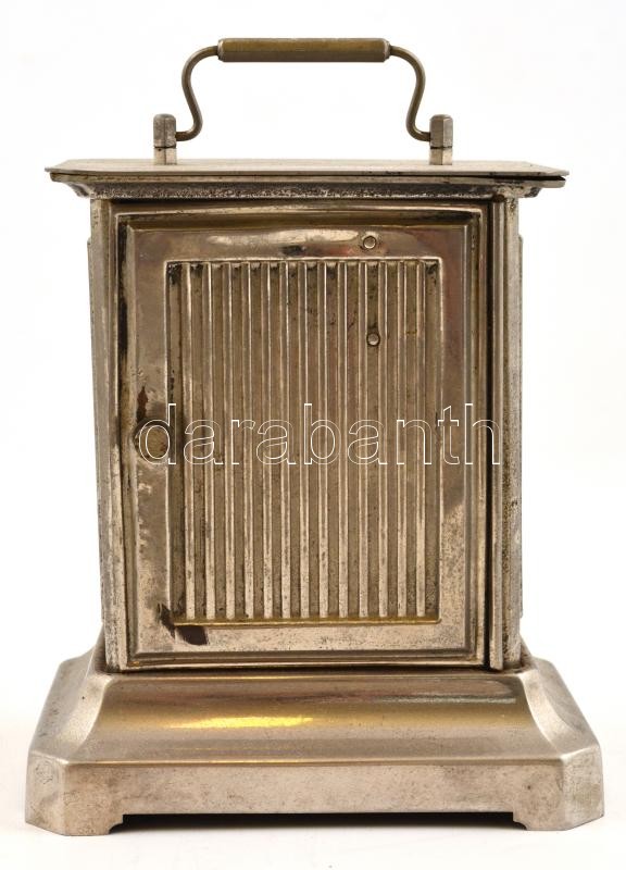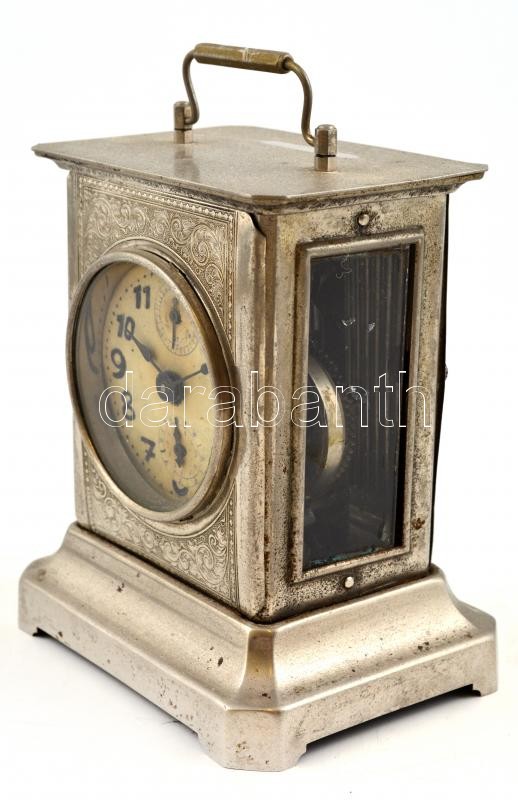 Beschreibung: Fém mechanikus, ébresztős utazóóra. Javításra szoruló szerkezettel, felhúzó kulccsal m: 17 cm