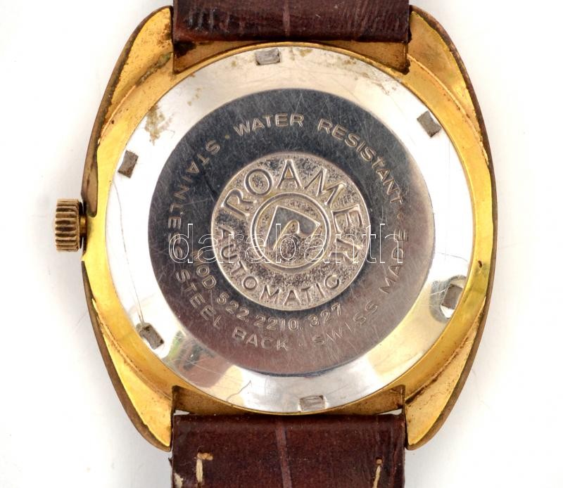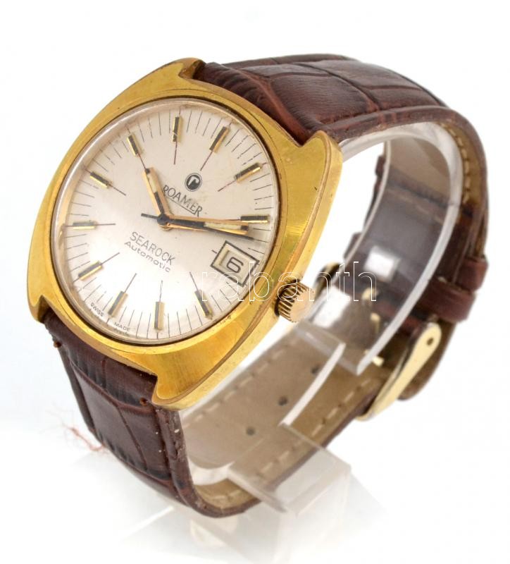 Beschreibung: Roamer Searock automata karóra, kissé kopottas bőr szíjjal, működik, üveglapja sérült
