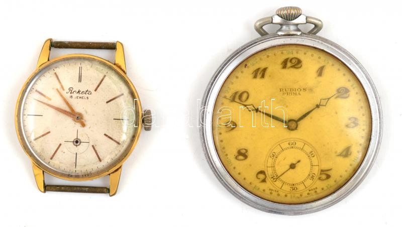Rubios Prima kézi felhúzós zsebóra működő állapotban d: 46 mm, Rakéta 16 köves kézi felhúzós férfi karóra, másodpercmutató nélkül. Működő állapotban d: 34 mm