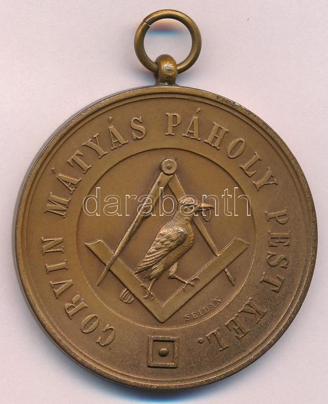 1869. "Corvin Mátyás Páholy Pest Kel. / Megnyittatott 000869iki Nyolcadik Hó 21én" Br szabadkőműves emlékmedál füllel. Szign.: SEIDAN (45mm) T:1-
