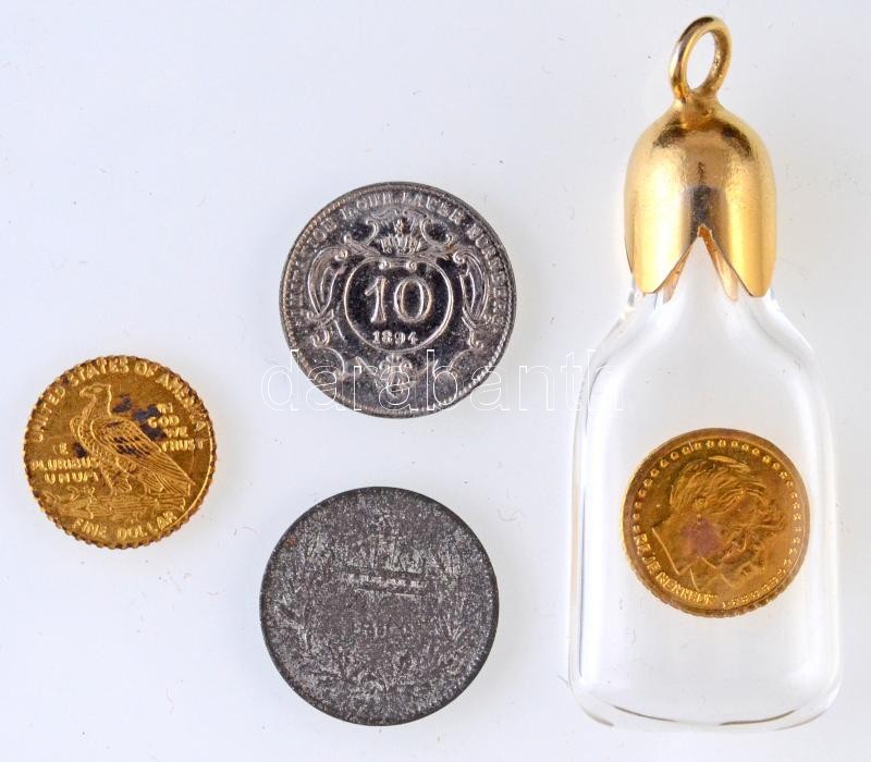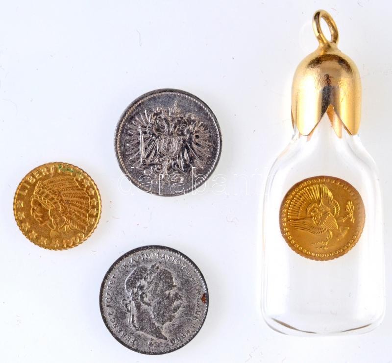 4db magyar és külföldi minipénz, közte 1895. 1K "Ferenc József" ezüstözött fém, Amerikai Egyesült Államok DN "Robert és John Kennedy" aranyozott minipénz kis üveg alakú medálban T:2,2-