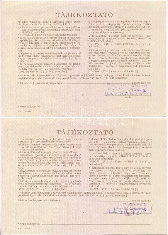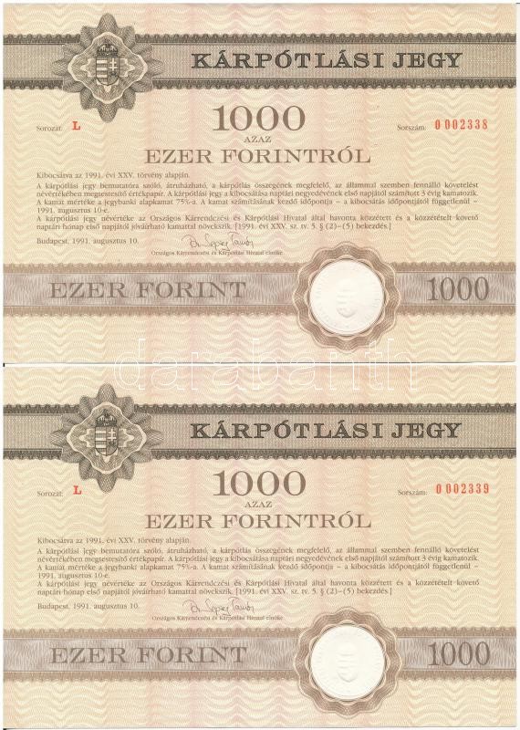 Beschreibung: Budapest 1991. "Országos Kárrendezési és Kárpótlási Hivatal" kárpótlási jegye 1000Ft-ról (2x) "0002338 - 0002339", "L" sorozat, sorszámkövetők T:I-