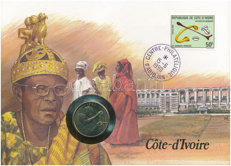 Elefántcsontpart felbélyegzett borítékban, bélyegzéssel, benne Nyugat Afrikai Államok 1990. 25Fr, német nyelvű leírással T:1 Ivory Coast in envelope with stamp and cancellation, in it West African States 1990. 25 Francs with German language description C:UNC
