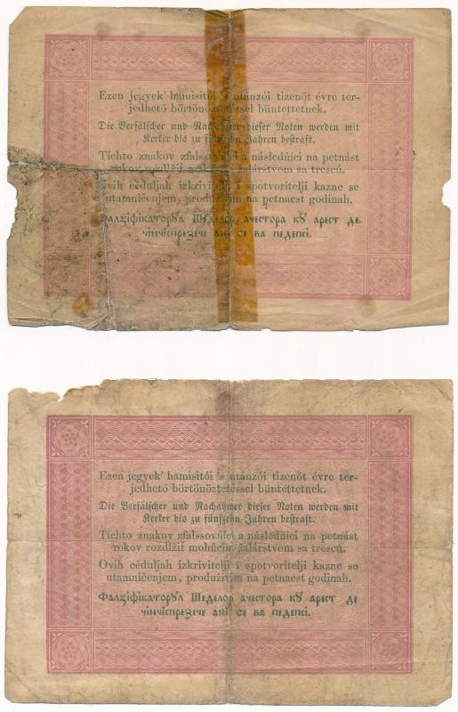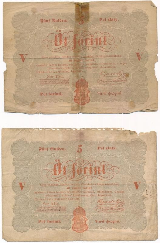 1848. 5Ft "Kossuth bankó" barna (2x) egyik hátlapi alapnyomata eltérő színű T:IV szakadás, ragasztás Hungary 1848. 5 Forint "Kossuth bankó" brown (2x) one with different color underprint on backside C:G tear, glued Adamo G109
