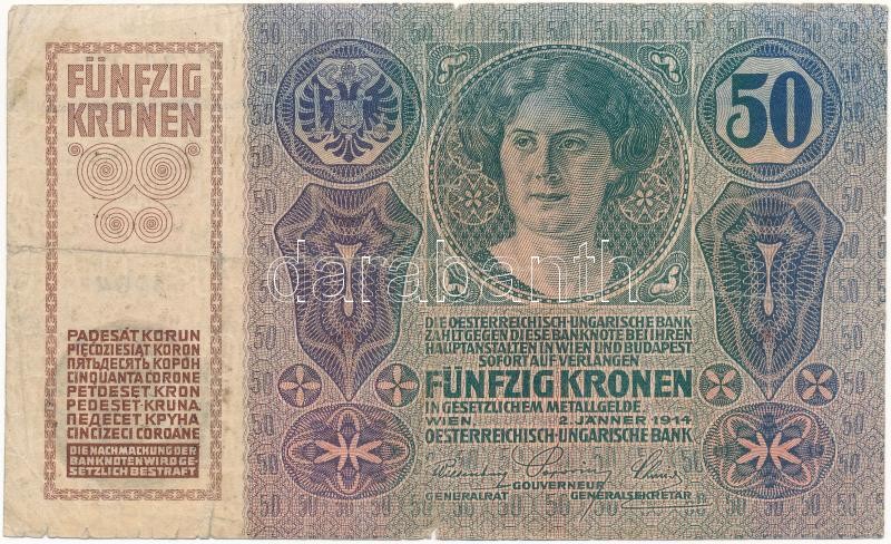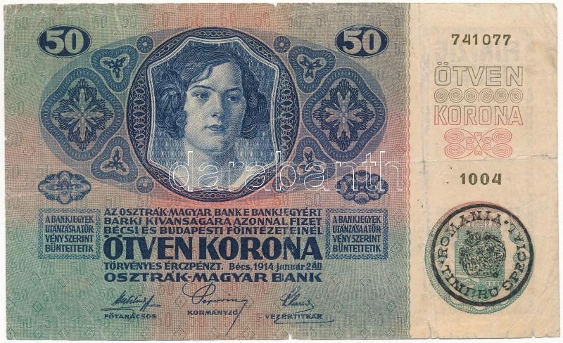 1914. 50K román felülbélyegzéssel T:III Adamo K24M https://www.darabanth.com/de/370-Fernauktion/370.0/Numismatik/Ungarische-Banknoten~2000007/1914-50K-roman-felulbelyegzessel-TIII-Adamo-K24M~II2153976