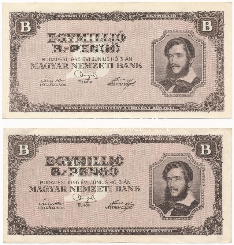 1946. 1.000.000BP (2x) T:II,III Adamo P37 https://www.darabanth.com/de/370-Fernauktion/370.0/Numismatik/Ungarische-Banknoten~2000007/1946-1000000BP-2x-TII-III-Adamo-P37~II2155980