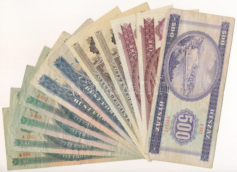 Beschreibung: 1962. 10Ft (2x) + 1969. 10Ft (2x) + 1980. 20Ft (2x) + 1983. 50Ft (2x) + 1989. 100Ft (2x) + 1990. 500Ft T:III,III- többnél szép papír