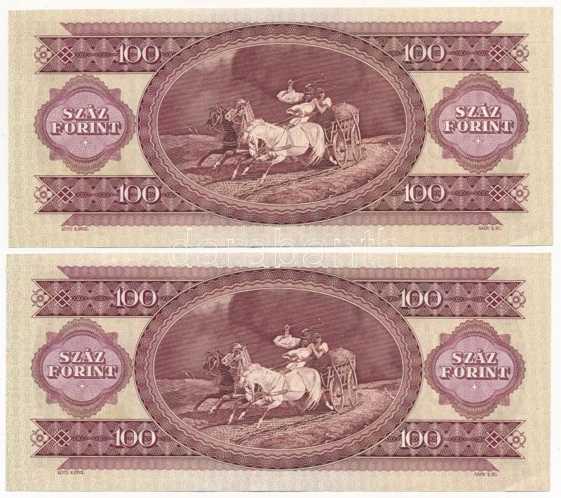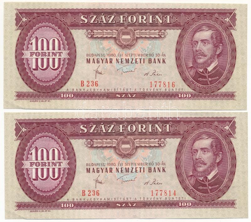 1980. 100Ft (2x) T:II Adamo F34 https://www.darabanth.com/de/370-Fernauktion/370.0/Numismatik/Ungarische-Banknoten~2000007/1980-100Ft-2x-TII-Adamo-F34~II2132405