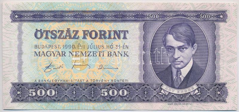 Adamo F43 https://www.darabanth.com/de/370-Fernauktion/370.0/Numismatik/Ungarische-Banknoten~2000007/1990-500Ft-TI-nyomdai-festekfoltok-Adamo-F43~II2146665