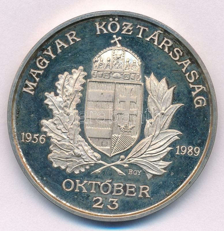 Bognár György (1944-) 1990. "Magyar Köztársaság 1956-1989. Október 23. / Hazádnak rendületlenül légy híve, oh magyar" Ag emlékérem (31,64g/0.925/42,5mm) T:1- (PP)
