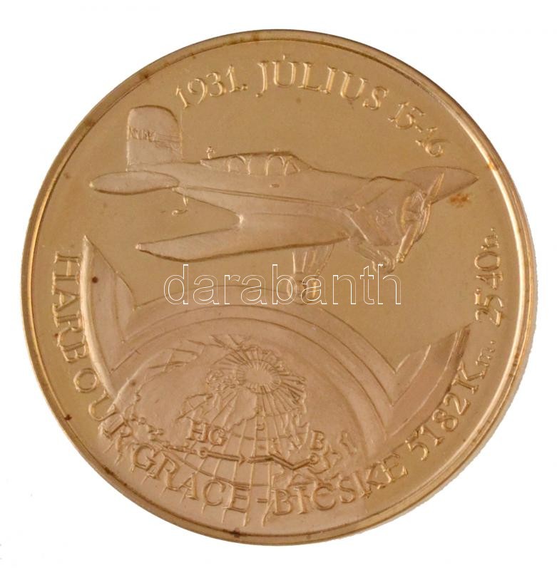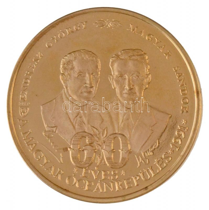Bozó Gyula (1913-2004) 1991. "60 éves a magyar óceánrepülés Endresz György - Magyar Sándor / Harbour Grace - Bicske" aranyozott fém emlékérem (42,5mm) T:1