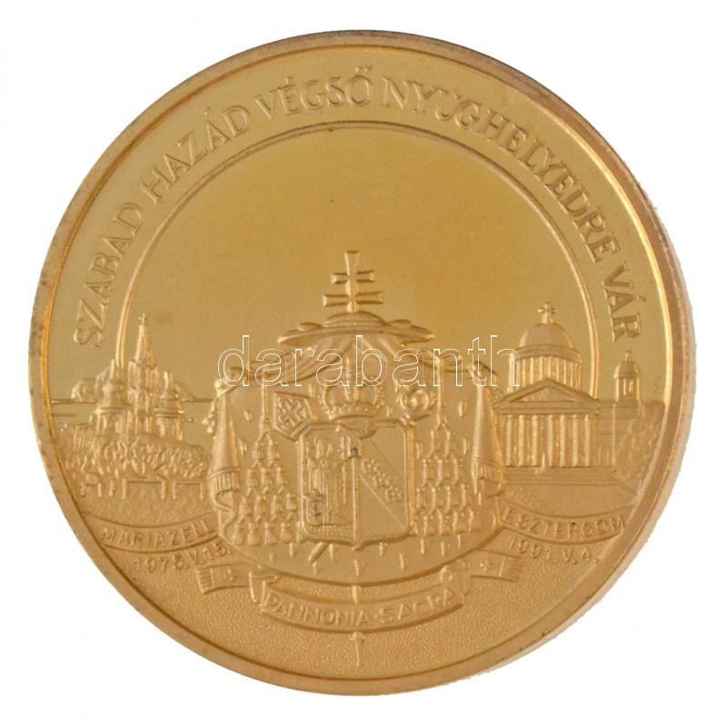 Bozó Gyula (1913-2004) / Szabó Géza (1939-) 1991. Mindszenty bíboros emlékére készült aranyozott fém emlékérem "JOSEPHUS CARD.MINDSZENTY PRINCEPS PRIMAS 1892-1975 / SZABAD HAZÁD VÉGSŐ NYUGHELYEDRE VÁR" (42,5mm) T:1-