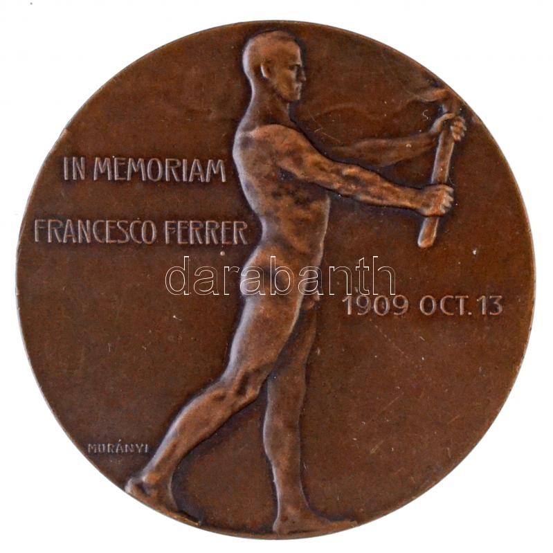 Murányi Gyula (1881-1920) 1909. "Francesco Ferrer emlékére" Br emlékérem. "IN MEMORIAM FRANCESCO FERRER 1909 OCT. 13" (30,56g/50,5mm) T:2 ph. / Hungary 1909. "To the Memory of Francesco Ferrer" Br commemorative medallion. Sign.: Gyula Murányi (40,56g/50,5mm) C:XF edge error HP 3691.