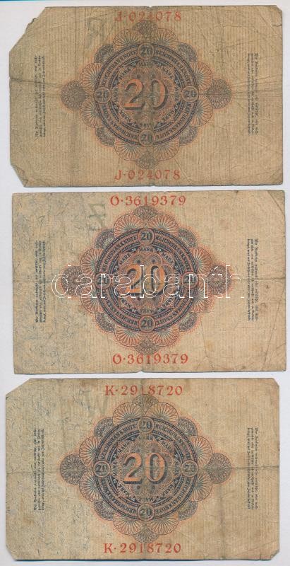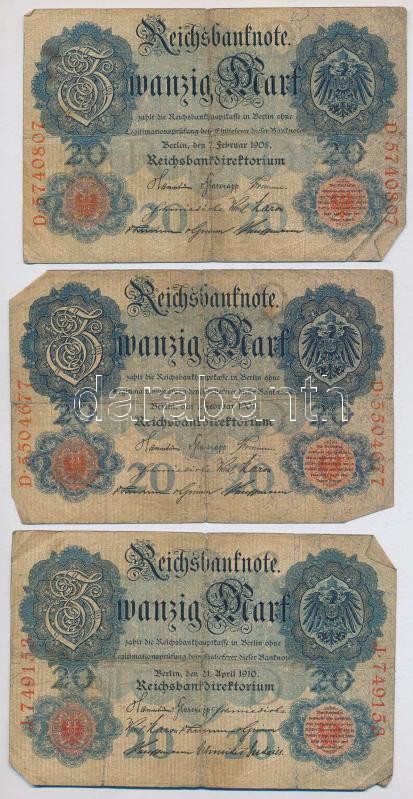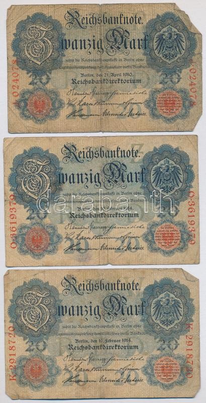 Német Birodalom 1908. 20M (2x) + 1910. 20M (2x) + 1914. 20M (2x) T:III... https://www.darabanth.com/de/370-Fernauktion/370.0/Numismatik/Weltweit-Banknoten~2000014/Nemet-Birodalom-1908-20M-2x-plus-1910-20M-2x-plus-1914-20M-2x-TIII-IV-German-Empire-1908-20-~II2146404