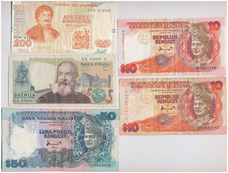 Beschreibung: vegyes bankjegy tétel: Olaszország 1973. 2000L + Görögország 1996. 200D + Malajzia 1995. 10R (2x) + 1987. 50R T:III