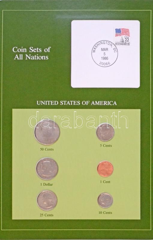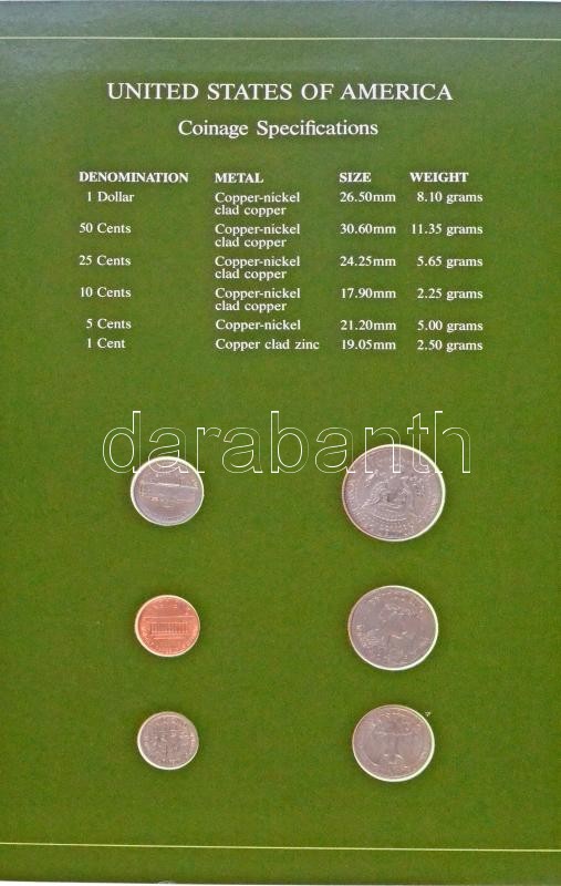 Amerikai Egyesült Államok 1980-1985. 1c - 1$ (6xklf), "Coin Sets of All Nations" forgalmi szett felbélyegzett kartonlapon T:1,1- USA 1980-1985. 1 Cent - 1 Dollar (6xdiff) "Coin Sets of All Nations" coin set on cardboard with stamp C:UNC,AU