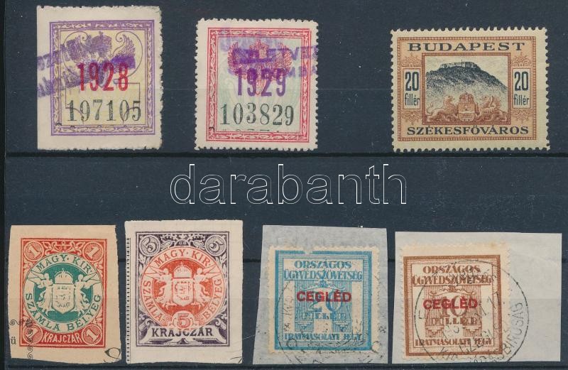 Beschreibung: 7 db különböző illeték, közte számla, ügyvéd, stb.