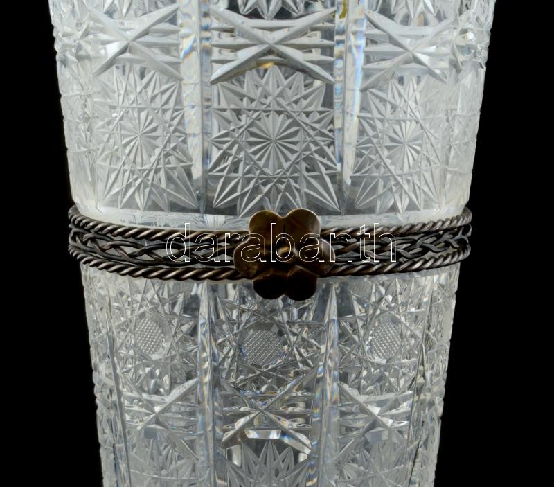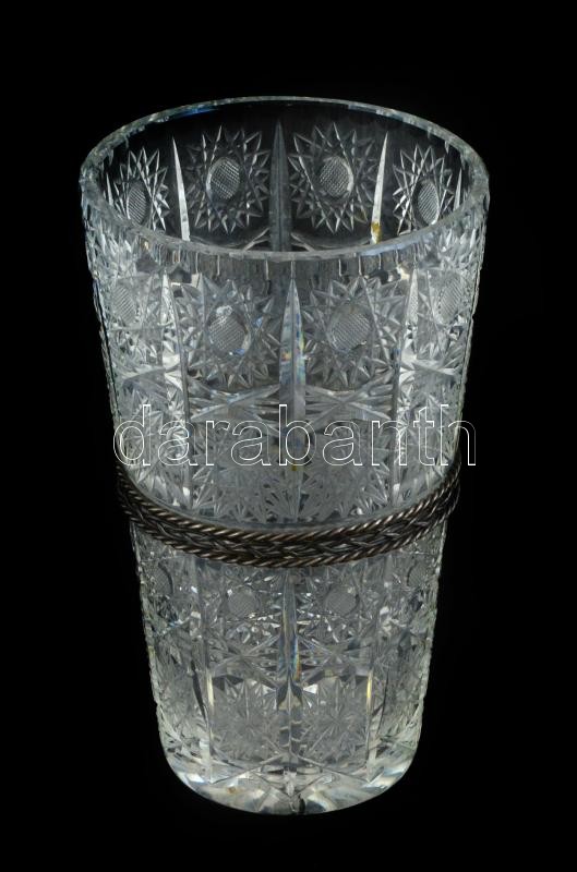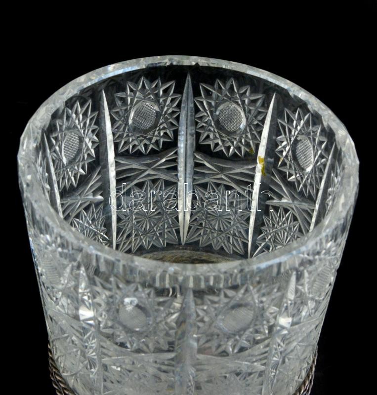 Beschreibung: Csiszolt ólomkristály váza, ezüst díszítéssel, jelzés nélküli, karcolásokkal, foltokkal m: 20,5 cm