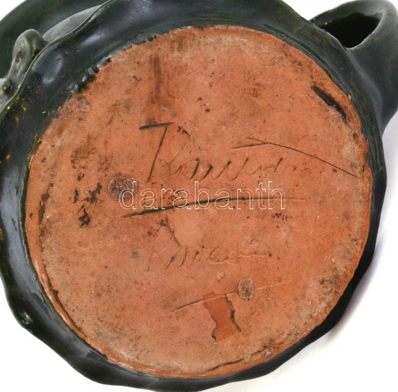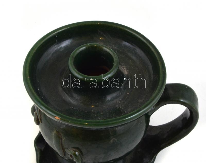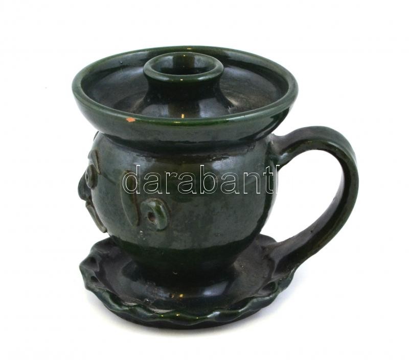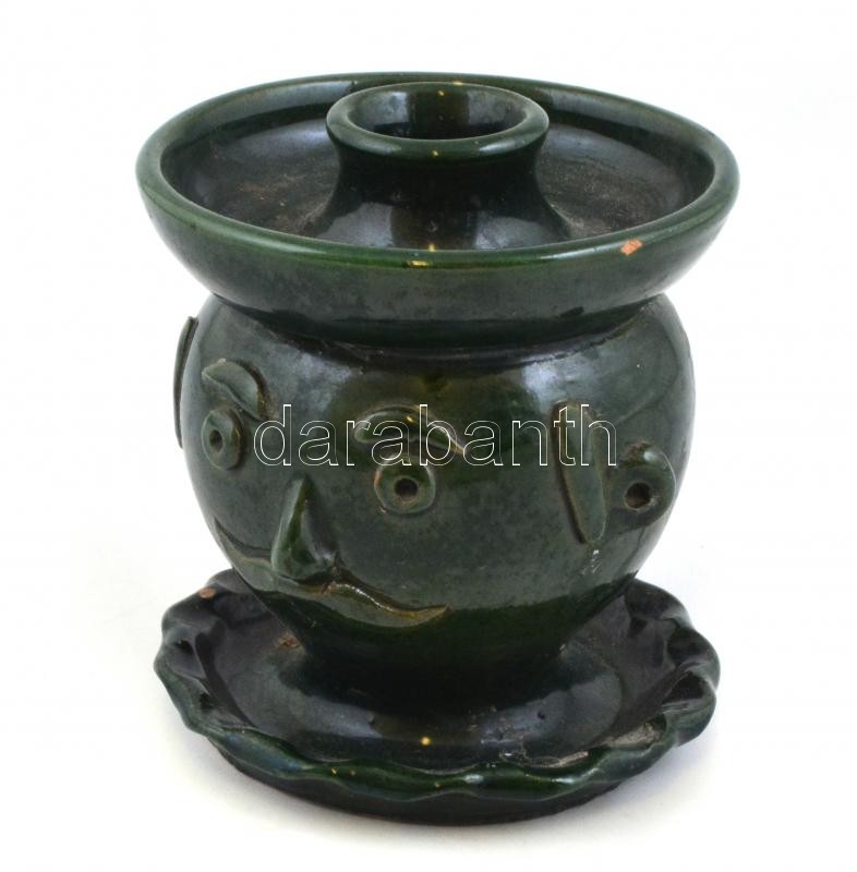 Beschreibung: Fej alakú gyertyatartó, alján jelzett, mázas kerámia lepattanással, m: 15 cm