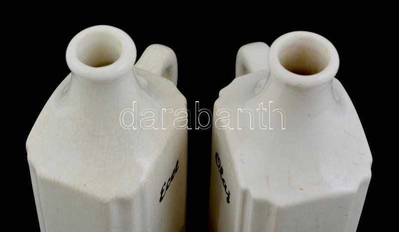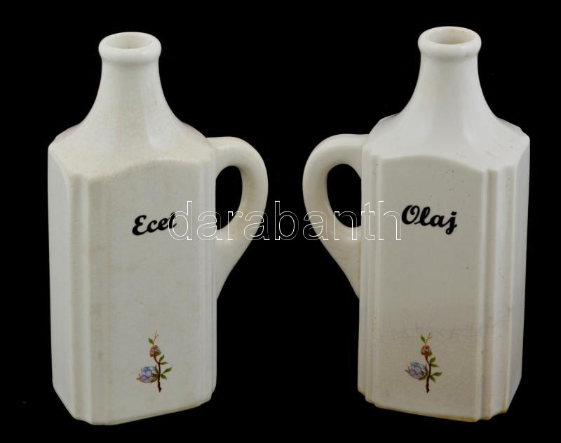 Beschreibung: 2 db jelzetlen porcelán olaj és ecettartó, matricás, dugóval, kopott, koszos, kis csorbával
