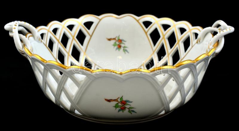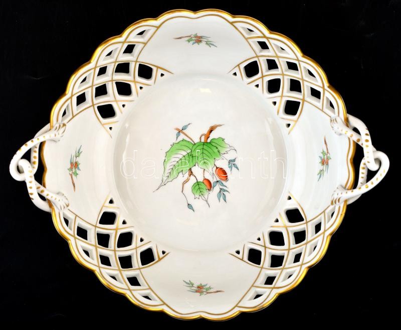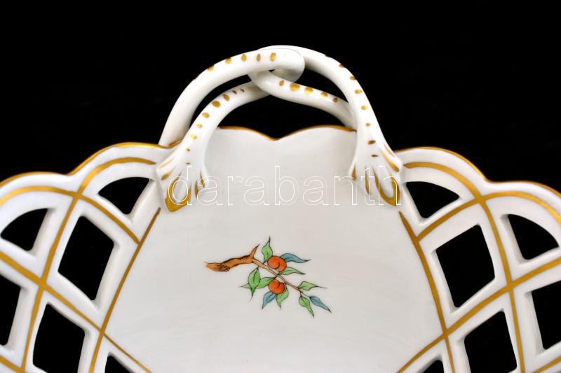 Beschreibung: Herendi csipkebogyó mintás áttört kínáló, kézzel festett, jelzett, hibátlan. d: 22 cm, m: 8 cm