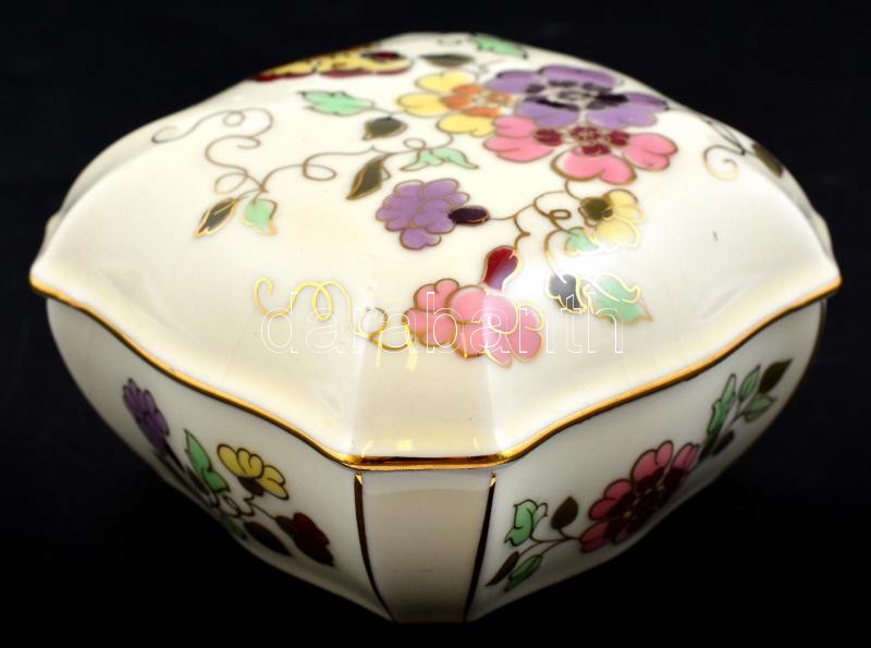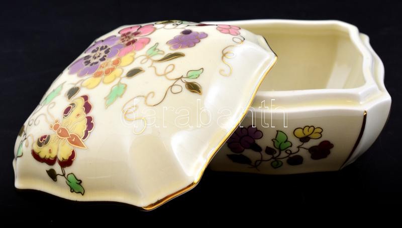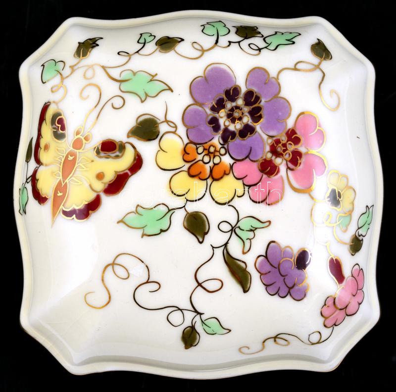 Beschreibung: Zsolnay pillangó mintás bonbonier, kézzel festett, apró mázhibákkal, 10×10 cm