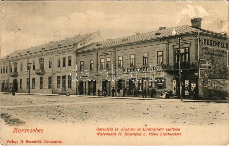 1918 Karánsebes, Caransebes; H. Rosenfeld üzlete és saját kiadása, Lichtneckert szállodája a zöld fához, Merzig üzlete / street, shop, hotel (felszíni sérülés / surface damage)