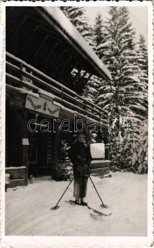 Beschreibung: 1942 Nagybánya, Baia Mare; Bányai-havasok, Erdélyi Kárpát Egyesület Gutin osztályának menedékháza télen, síelő, téli sport / chalet, skier, winter sport. photo