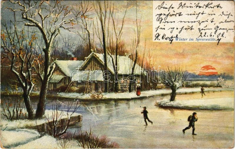 Beschreibung: 1902 Winter im Spreewalde / ice skating, winter sport. Gebrüder Grunert Künstlerkarte Serie I. "Spreewald-Bilder" (small tear)