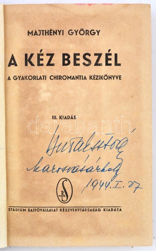 Majthényi György: A kéz beszél. A gyakorlati chiromantia kézikönyve. Bp., é. n., Stádium, 244 p. Harmadik kiadás. Kiadói félvászon-kötés, kissé kopott borítóval.