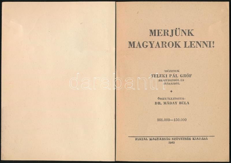 Dr. Máday Béla (szerk.): Merjünk magyarok lenni! Idézetek Teleki Pál gróf beszédeiből és írásaiból. Bp., 1943, Fiatal Magyarság Szövetség. Kiadói papírkötés, jó állapotban.