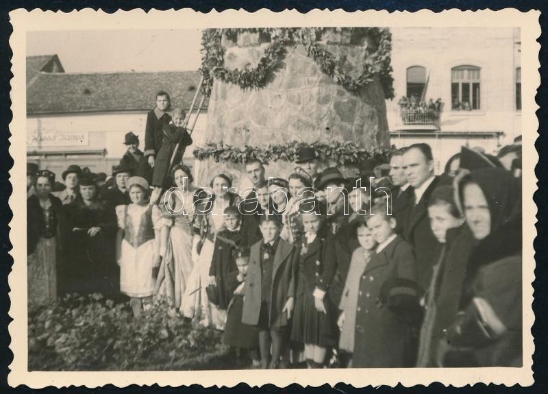 1940 A nagyszalontai országzászló avatás közönsége a zászlót tartó kőépítménynél, középen Kiss Ferenc a magyarországi Nagyszombati Társaság elnöke, mellette balra felesége, fotó, 6×8,5 cm
