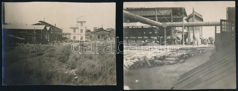 cca 1920-30 Diósgyőr (Miskolc) vasgyár, felvételek az üzemről, ipari vasúti vágányokról és vagonról, munkásokról, csarnokokról. 5 db vintage fotó, 8x9 és 8x11 cm közötti méretekben.